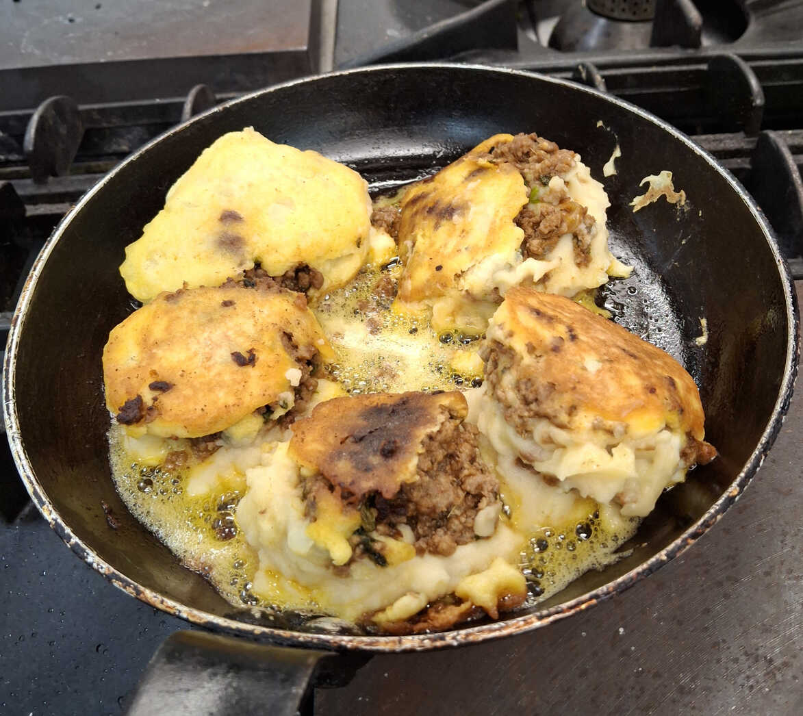 These are made with balls of a much firmer mashed potato than we used, folded around a nugget of spiced minced meat (keema), often breaded, and then fried the same way.