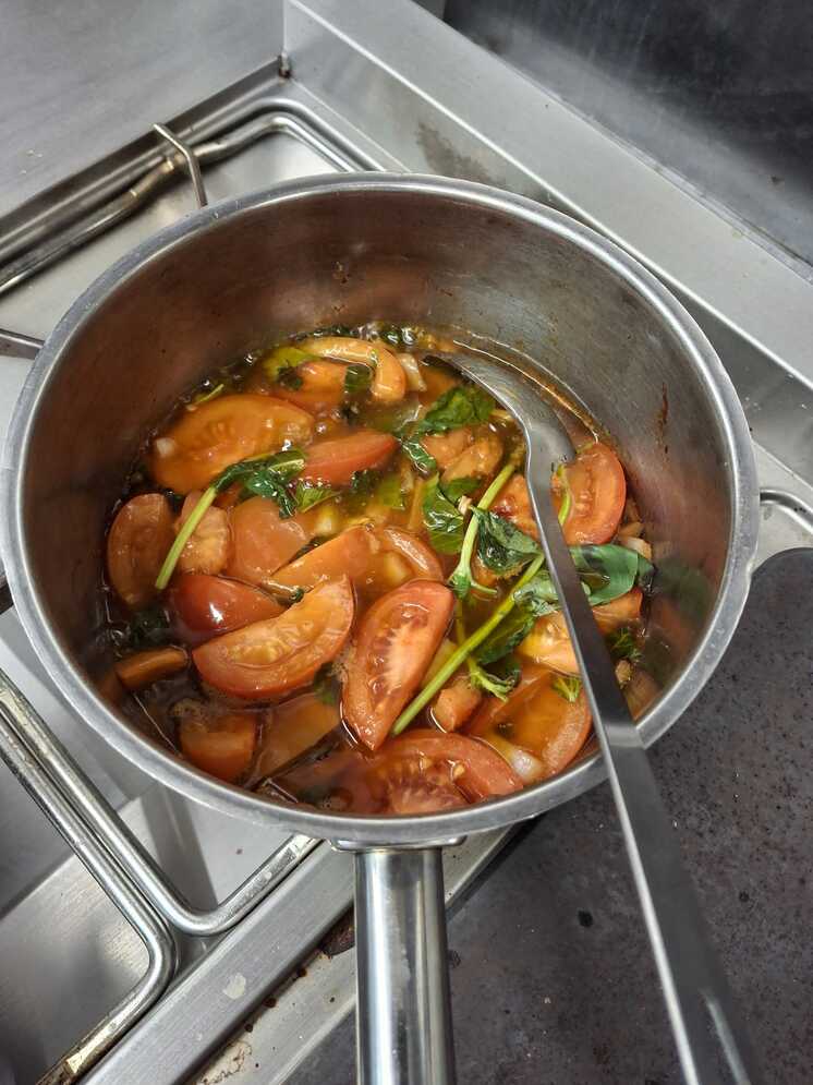 then chopped fresh tomatoes are added and reduced to a purée over 30 minutes to one hour. Herbs being added at the end.