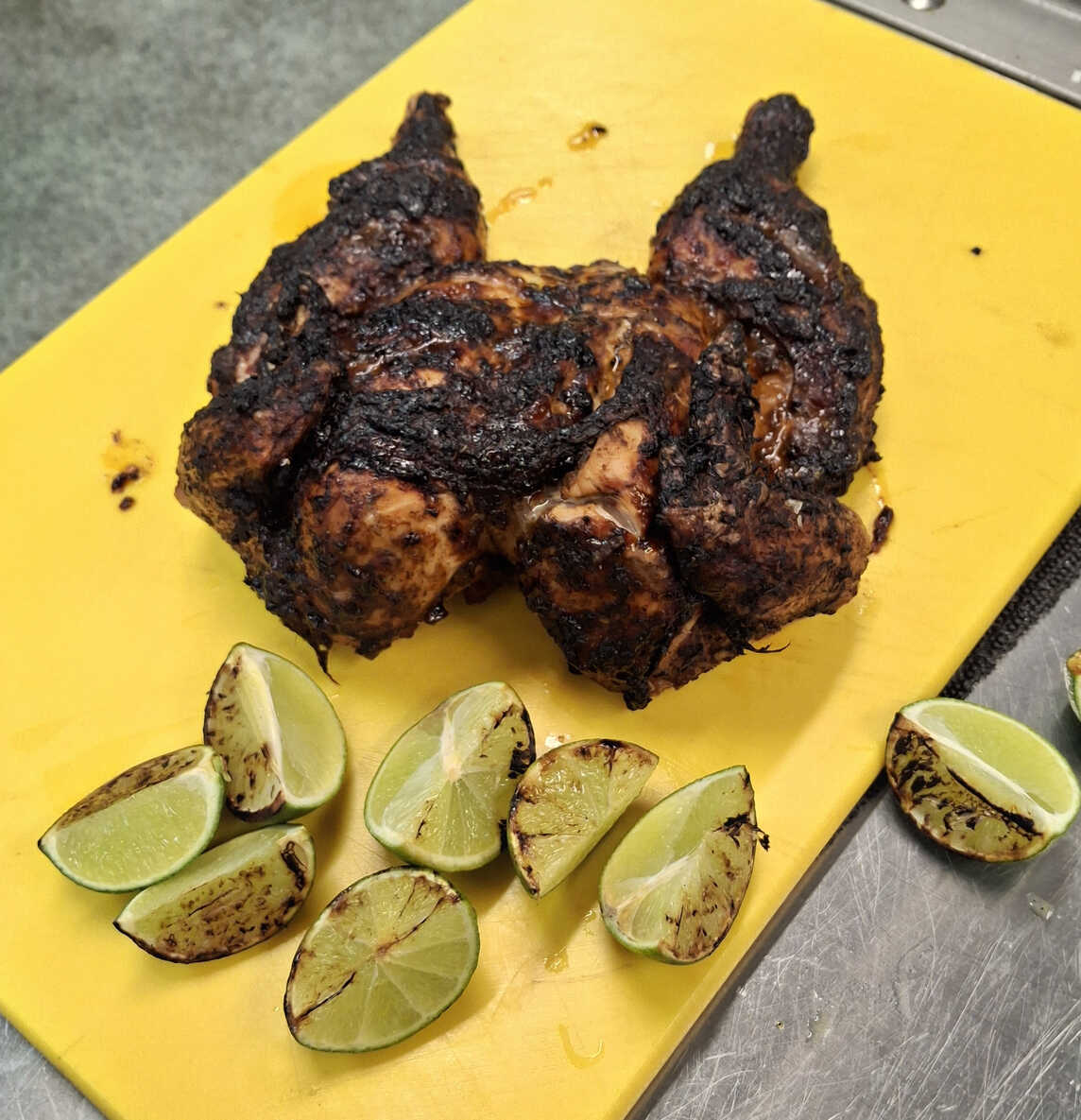 The advantage of splitting and flattening a chicken like this is that it can nearly halve the cooking time, help it cook more evenly, and allow better marinade penetration. If that's your jive.