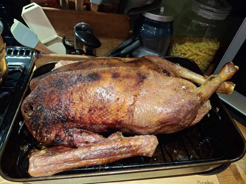This year's bird was particularly moist and delicious, and also produced copious quantities of juice, which is rarely the case. Perhaps the two are related?